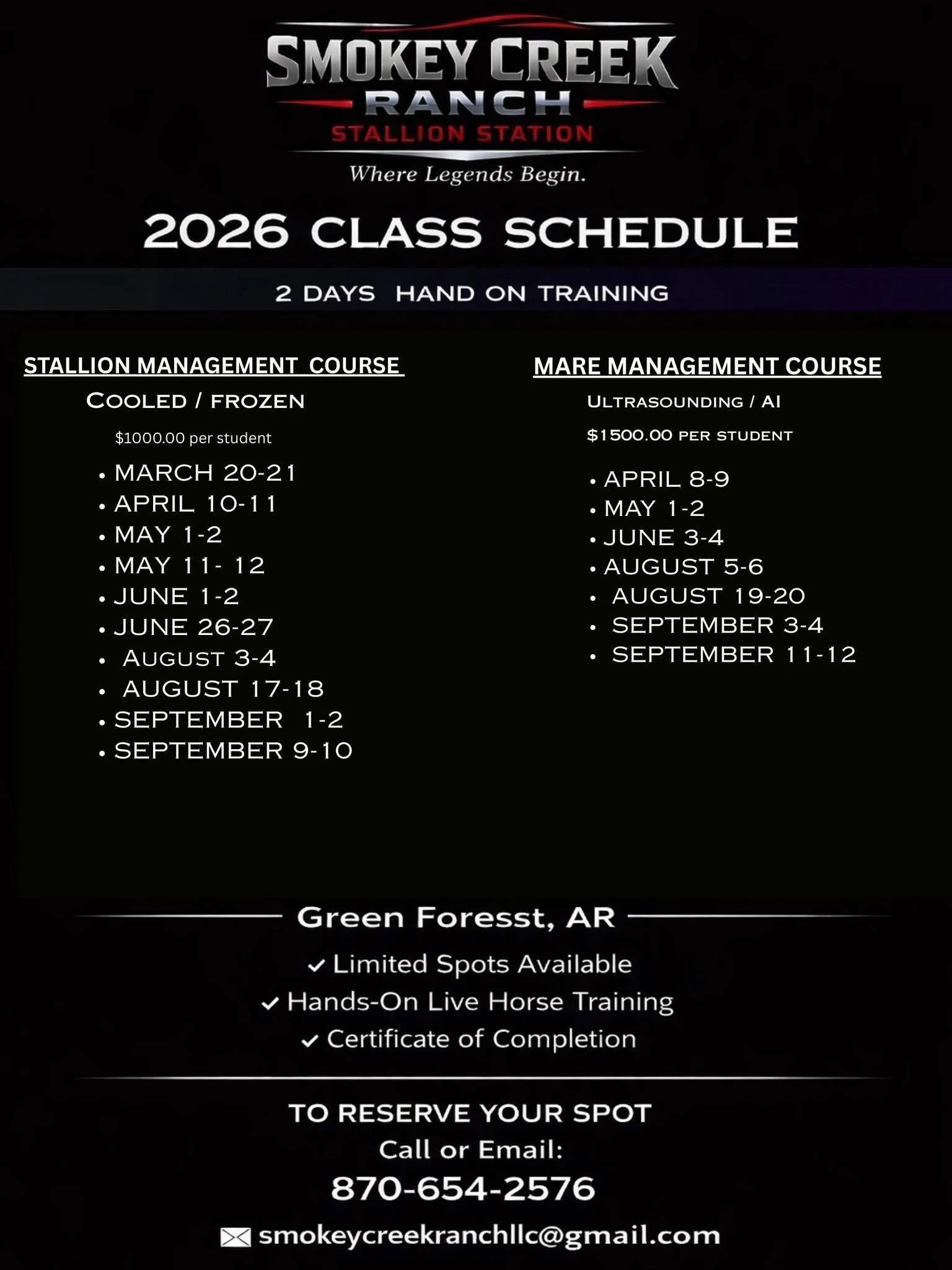 From mare care under lights to ensure early season cycling, to an experienced team that thrives with the challenge of mares requiring unique breeding requirements- Smokey Creek Ranch Stallion Station has you covered.