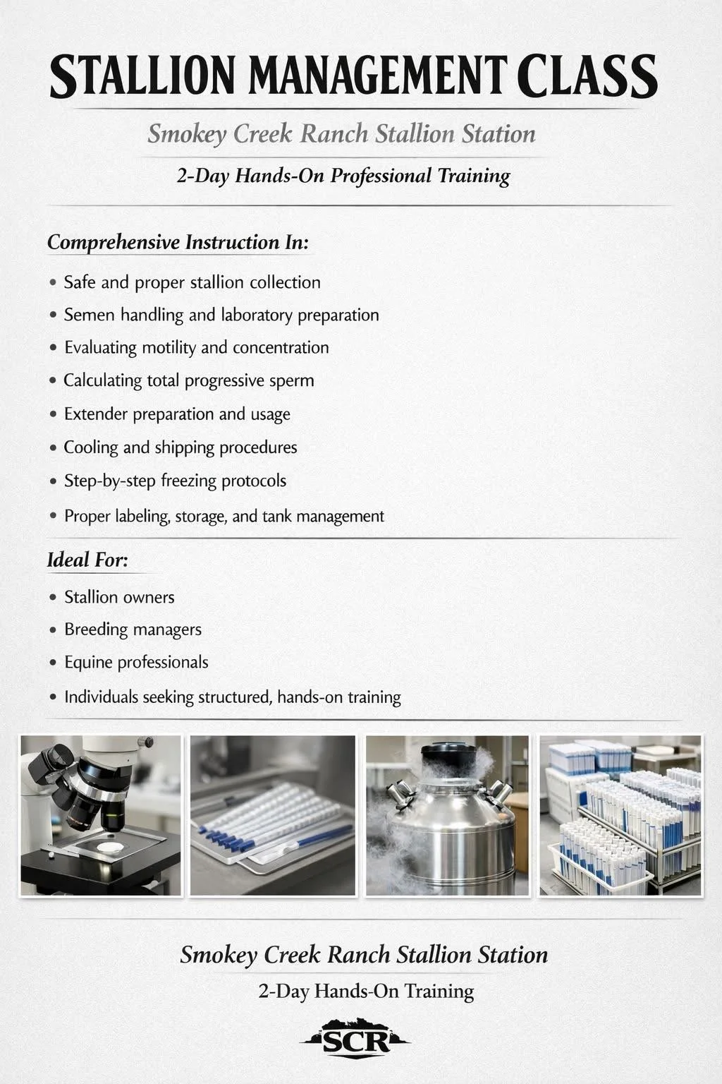 This two-day comprehensive course will cover Stallion Reproductive Management skills. Between classroom and hands-on instruction we will cover semen handling, evaluation, preparation and preservation protocols, and more.
